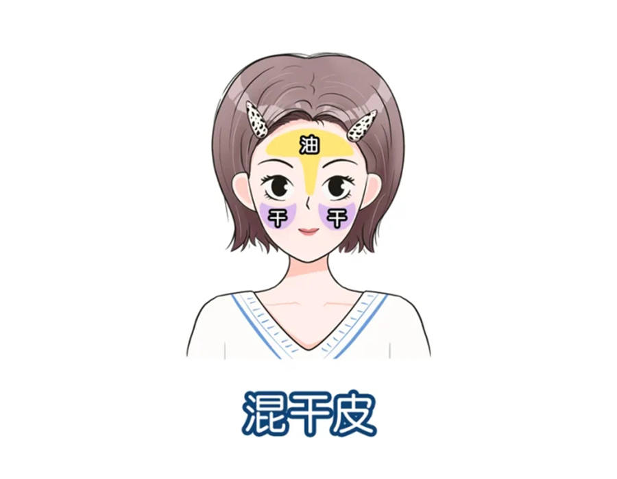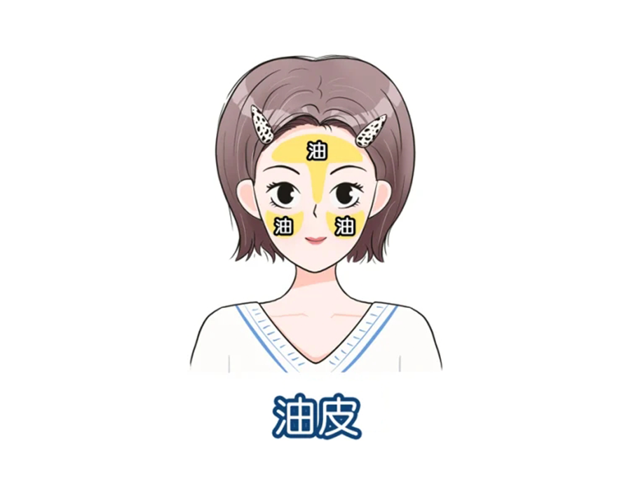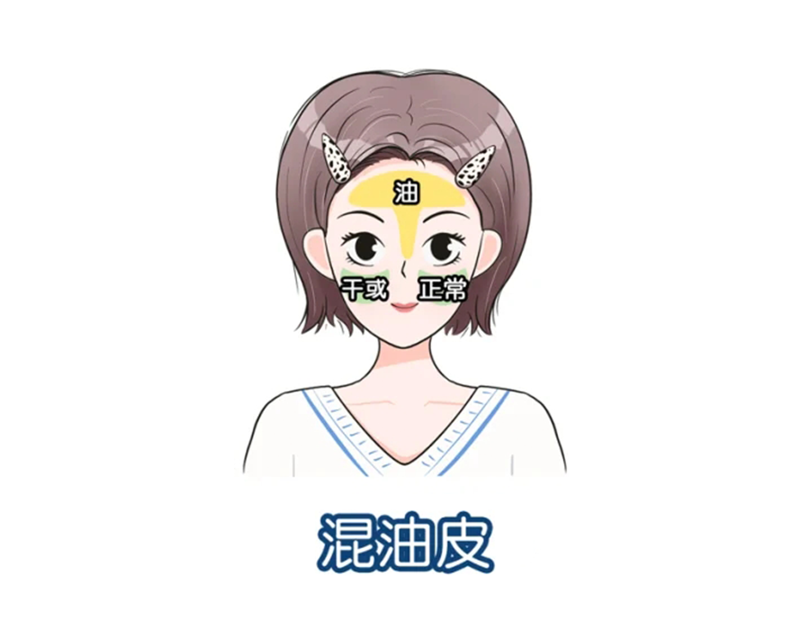 T区出油,T区毛孔粗大,脸颊肌肤偏干,容易长斑,眼周容易出现细纹。