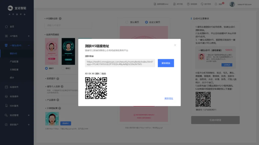 宜远智能API平台推出重磅新产品——“一键生成测肤H5”,快速搭建测肤入口,为您的用户提供服务,实现精准检测、个性化护肤推荐等功能。