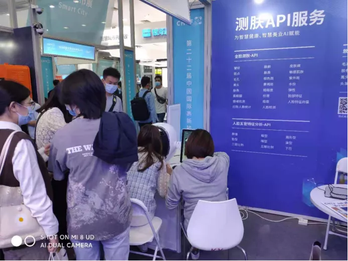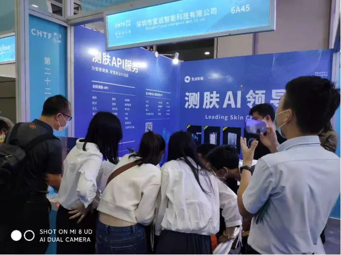 高交会智慧城市6号展馆,五天的展会期间,宜远智能展位(6A45)从开馆到闭馆时间,每一天都聚集着来自国内几国外对AI测肤技术感兴趣的专业商家及参观观众驻足停留,了解展位上最新的AI测肤产品及技术。