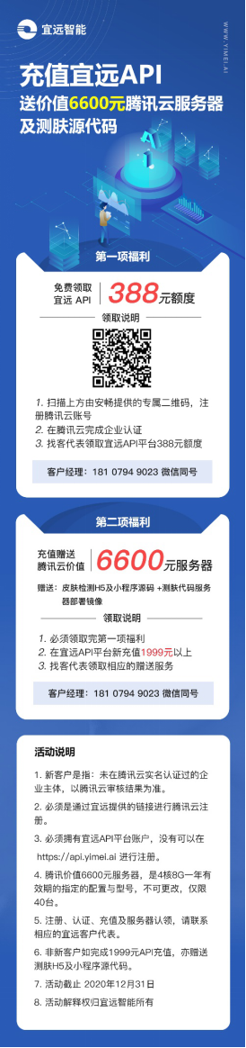 为回馈API新老客户,推出充值宜远测肤API,送价值6600元腾讯云服务器及测肤源代码的活动。具体操作参见下图,并请联系客户经理。