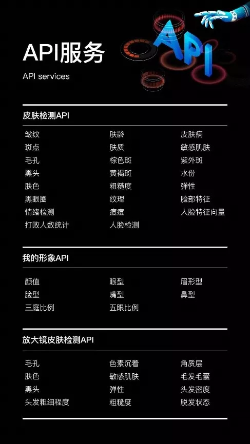 全线开放各类别的皮肤及人脸检测接口:“全脸”皮肤检测接口(23种),局部皮肤检测接口(12种),五官形象接口(8种)