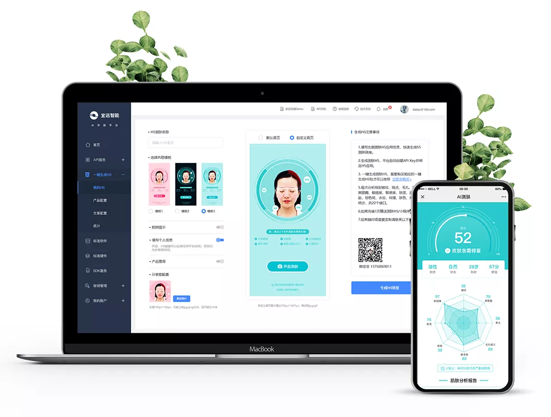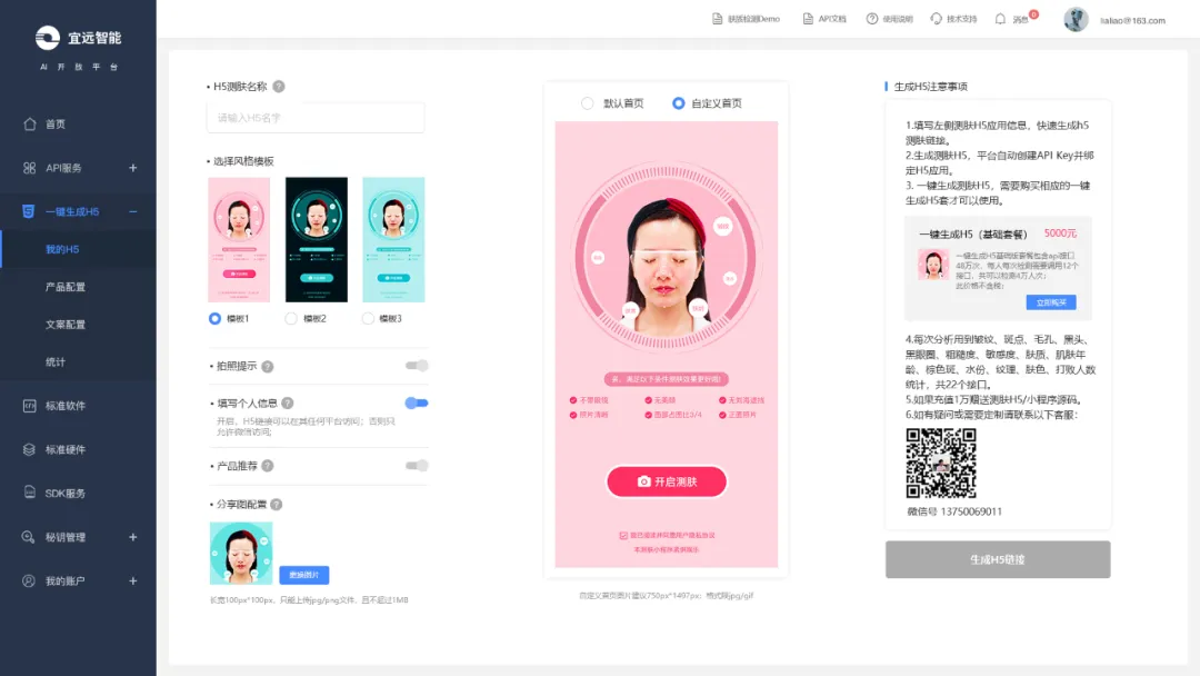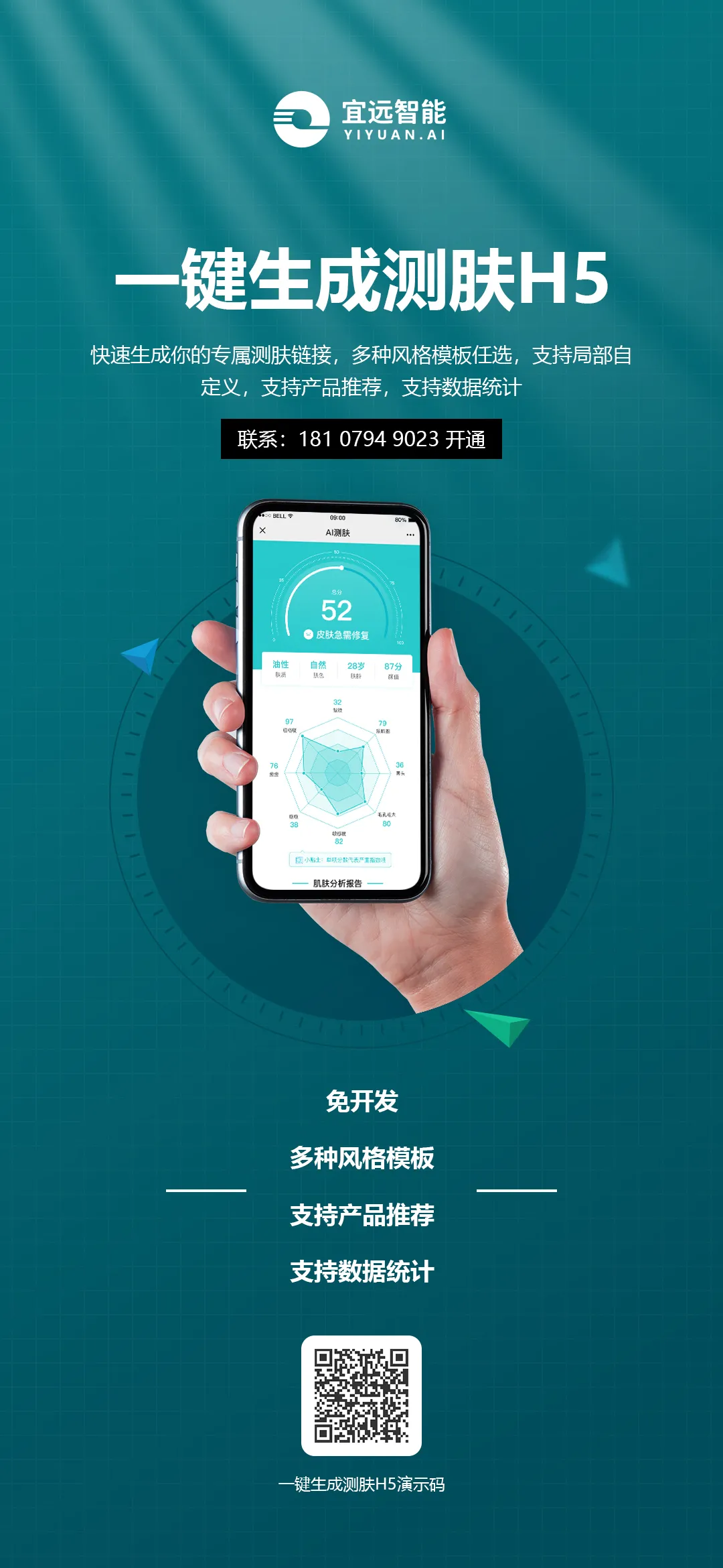 宜远智能API平台推出重磅新产品——“一键生成测肤H5”,快速搭建测肤入口,为您的用户提供服务,实现精准检测、个性化护肤推荐等功能。